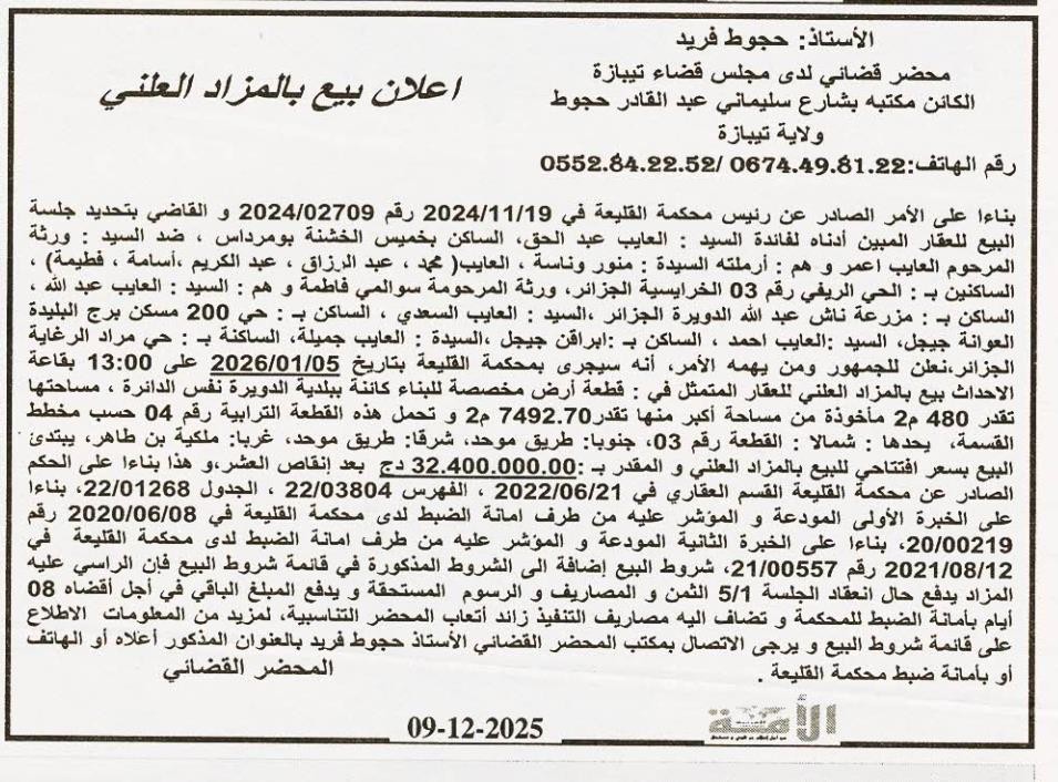 Il sera procédé à la vente au plus offrant et dernier enchérisseur le :
