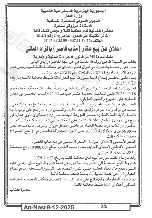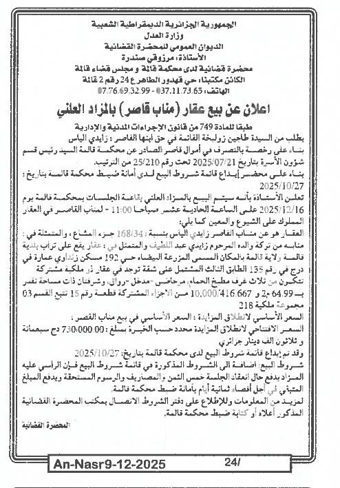 Il sera procédé à la vente au plus offrant et dernier enchérisseur le : 16/12/2025';
