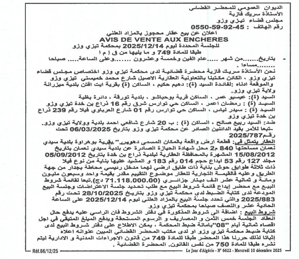 Il sera procédé à la vente au plus offrant et dernier enchérisseur le :