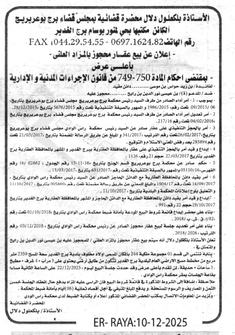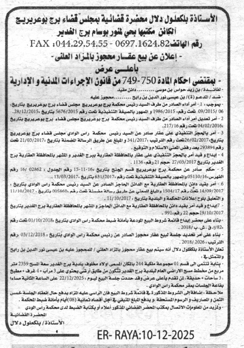 Il sera procédé à la vente au plus offrant et dernier enchérisseur le : 17/12/2025';