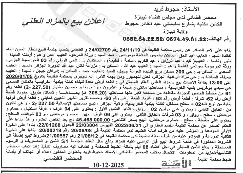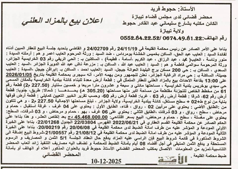 Il sera procédé à la vente au plus offrant et dernier enchérisseur le :