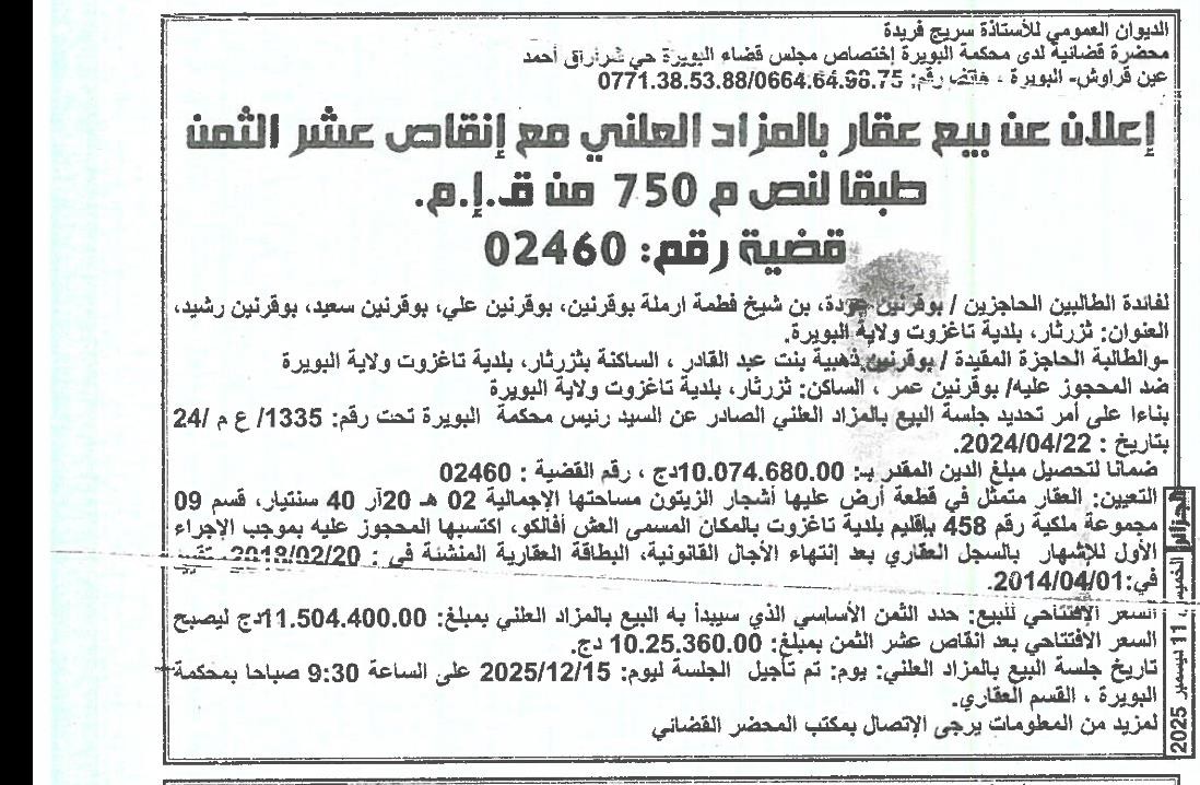 Il sera procédé à la vente au plus offrant et dernier enchérisseur le :