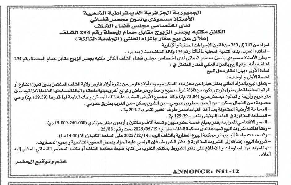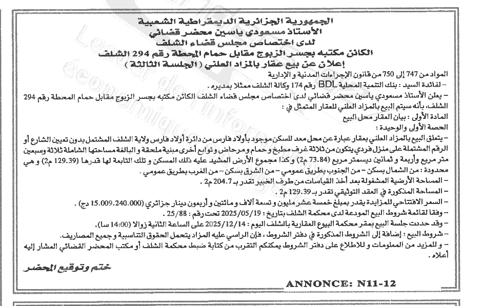 Il sera procédé à la vente au plus offrant et dernier enchérisseur le : 14/12/2025';