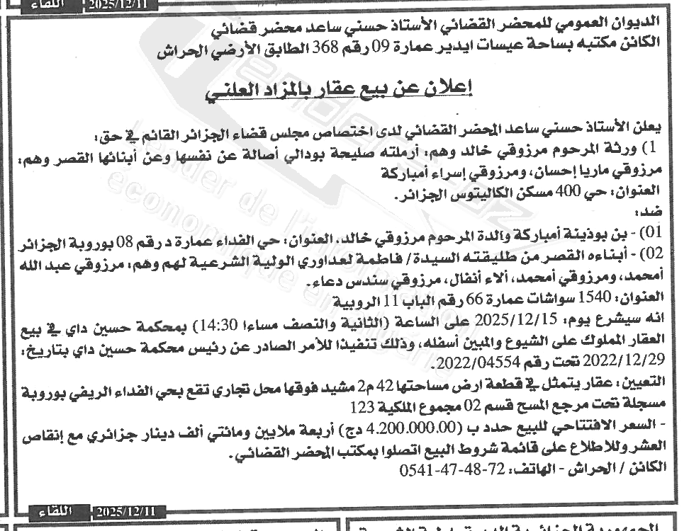 Il sera procédé à la vente au plus offrant et dernier enchérisseur le :