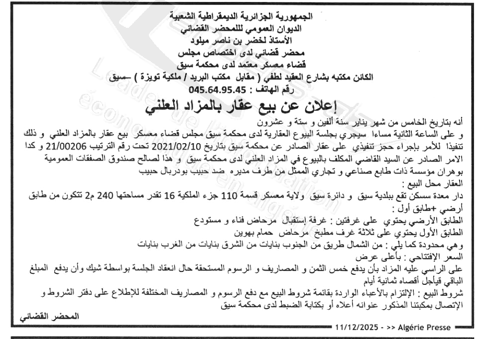 Il sera procédé à la vente au plus offrant et dernier enchérisseur le :