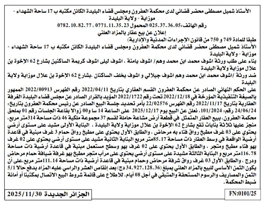Il sera procédé à la vente au plus offrant et dernier enchérisseur le :