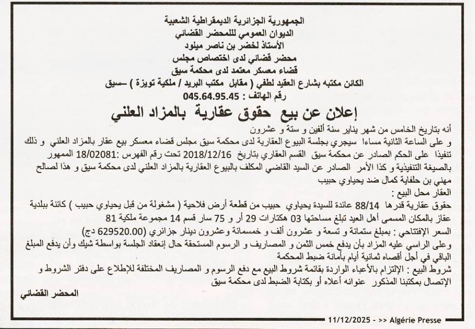 Il sera procédé à la vente au plus offrant et dernier enchérisseur le :