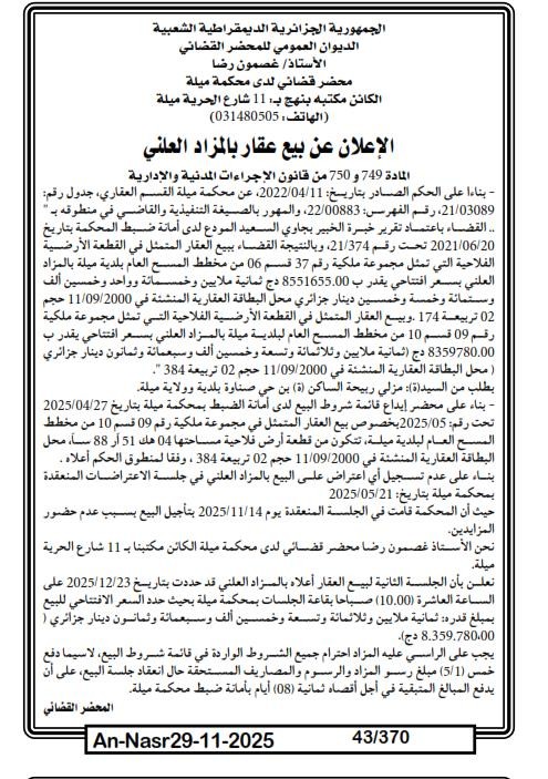 Il sera procédé à la vente au plus offrant et dernier enchérisseur le :