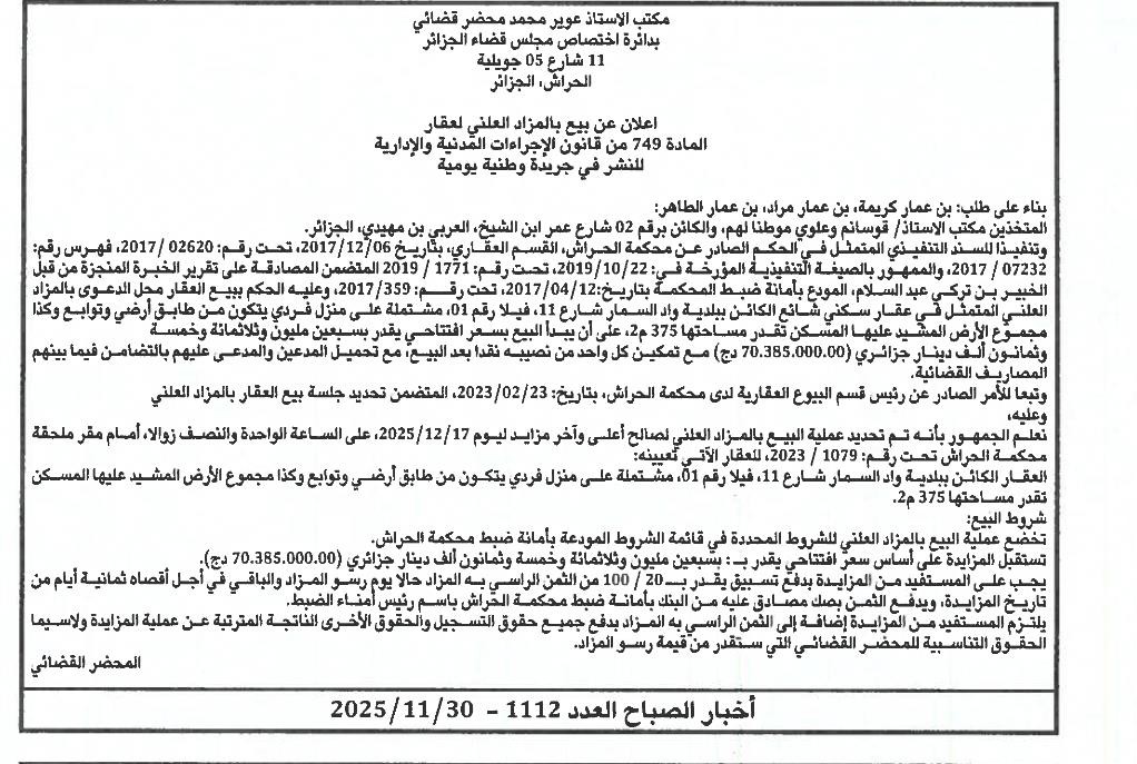 Il sera procédé à la vente au plus offrant et dernier enchérisseur le :