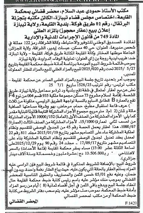 Il sera procédé à la vente au plus offrant et dernier enchérisseur le :