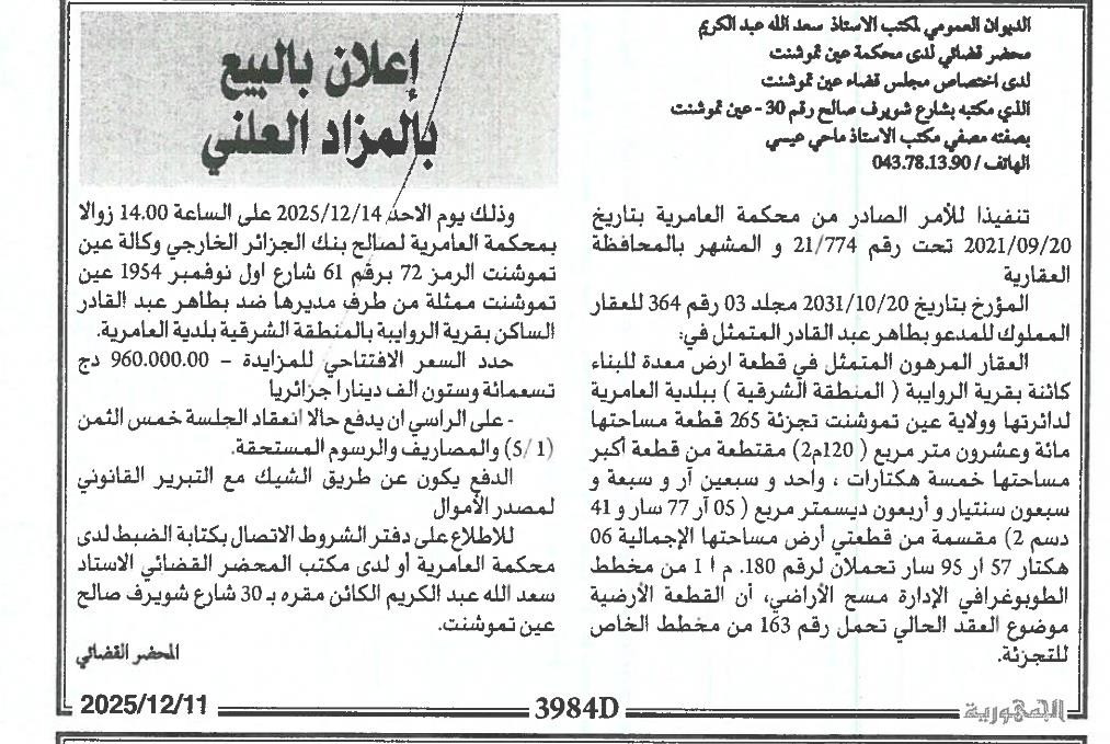 Il sera procédé à la vente au plus offrant et dernier enchérisseur le : 18/12/2025';