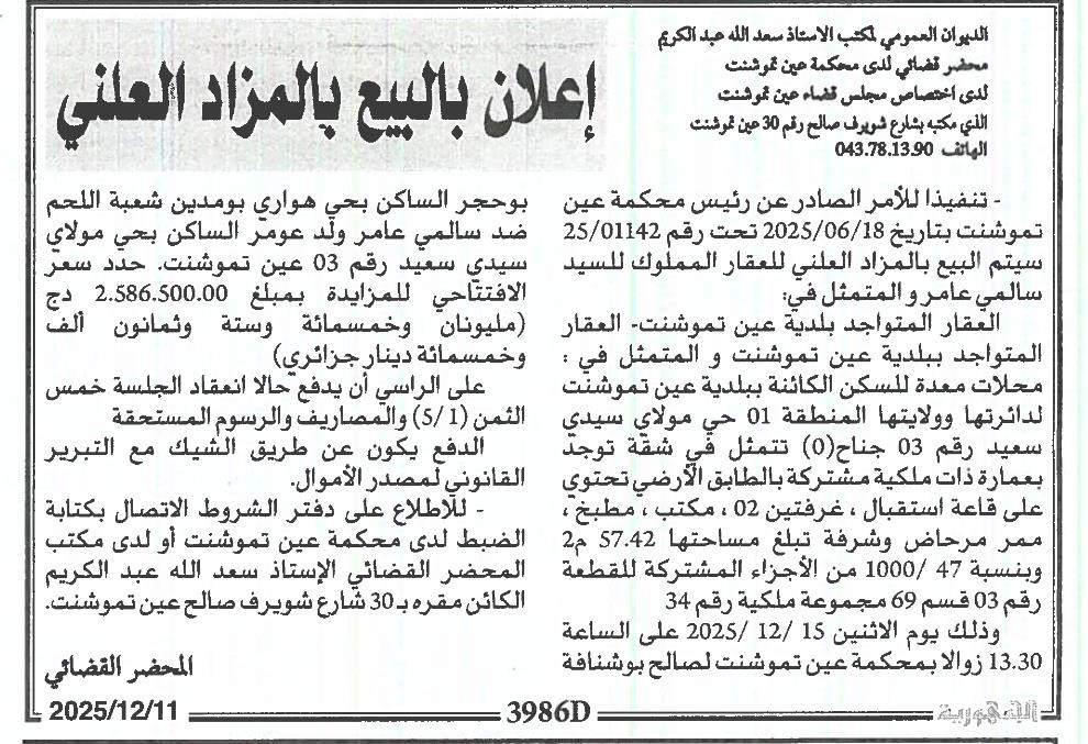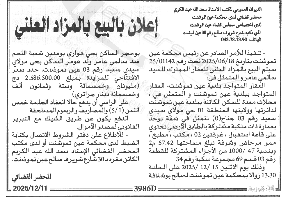 Il sera procédé à la vente au plus offrant et dernier enchérisseur le : 18/12/2025';