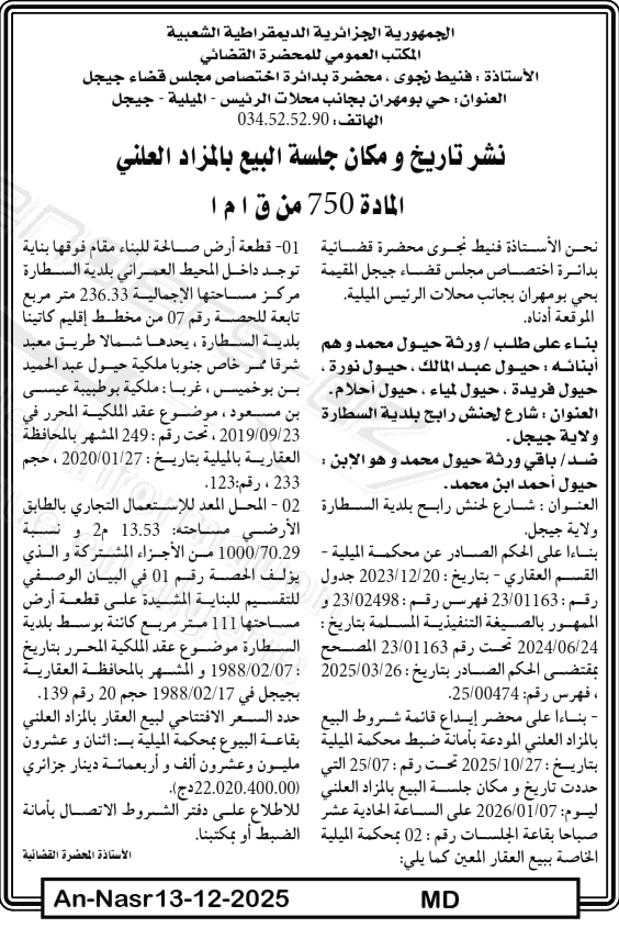Il sera procédé à la vente au plus offrant et dernier enchérisseur le :