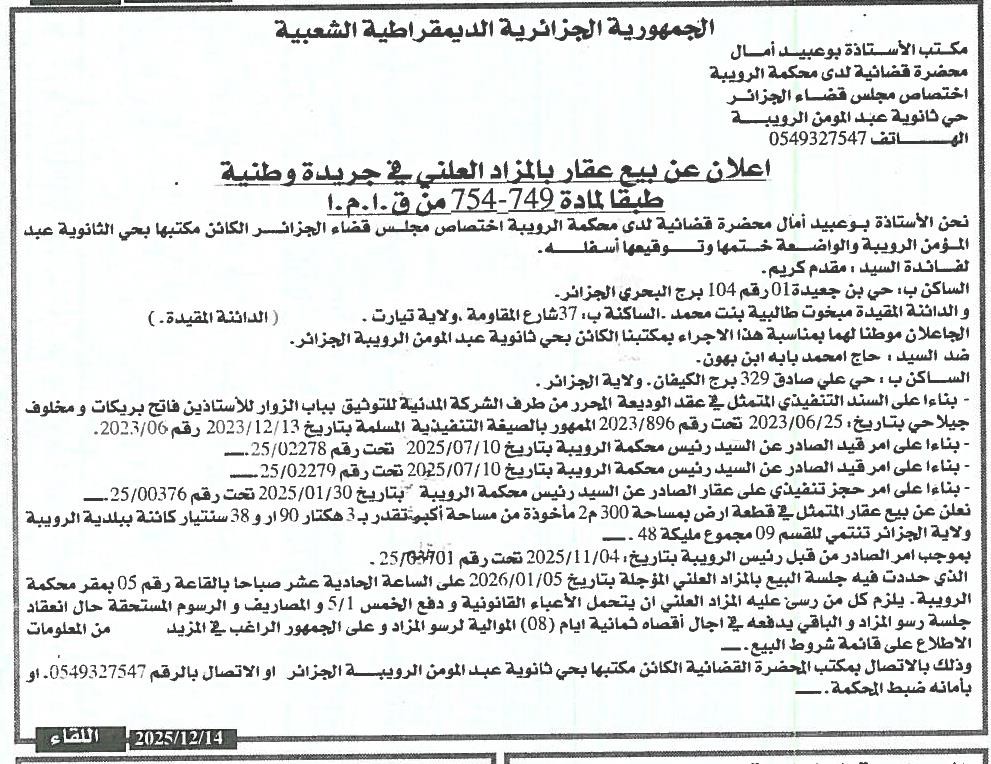 Il sera procédé à la vente au plus offrant et dernier enchérisseur le :