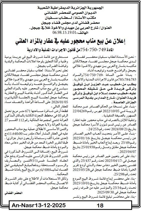 Il sera procédé à la vente au plus offrant et dernier enchérisseur le :