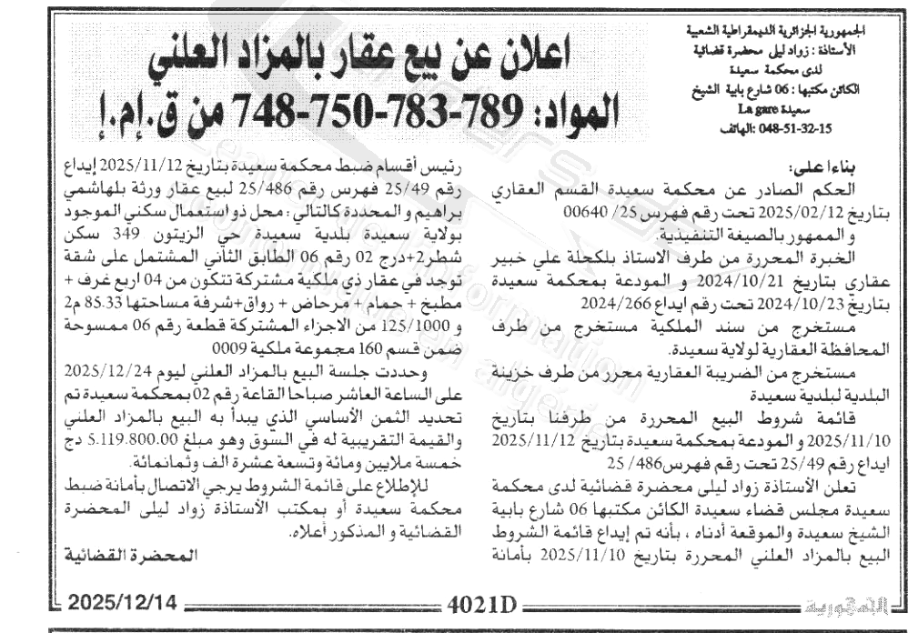 Il sera procédé à la vente au plus offrant et dernier enchérisseur le :