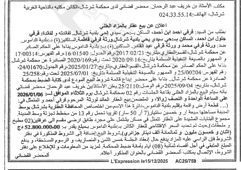 Il sera procédé à la vente au plus offrant et dernier enchérisseur le : 22/12/2025';