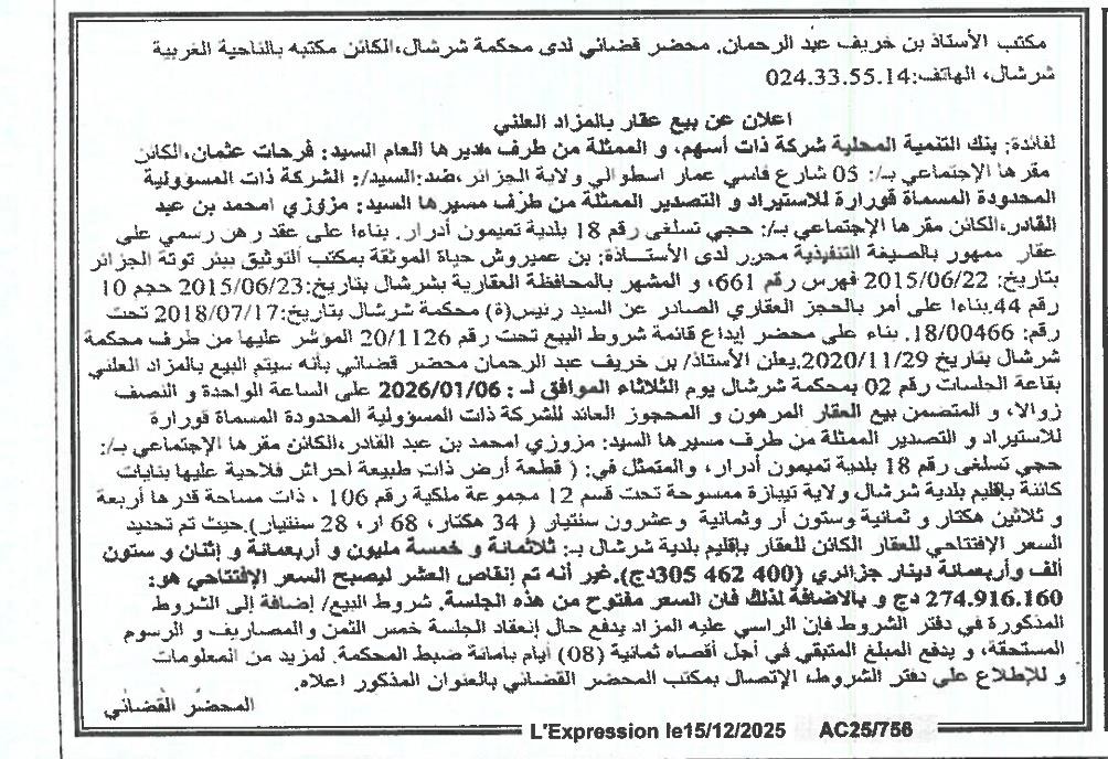 Il sera procédé à la vente au plus offrant et dernier enchérisseur le : 22/12/2025';