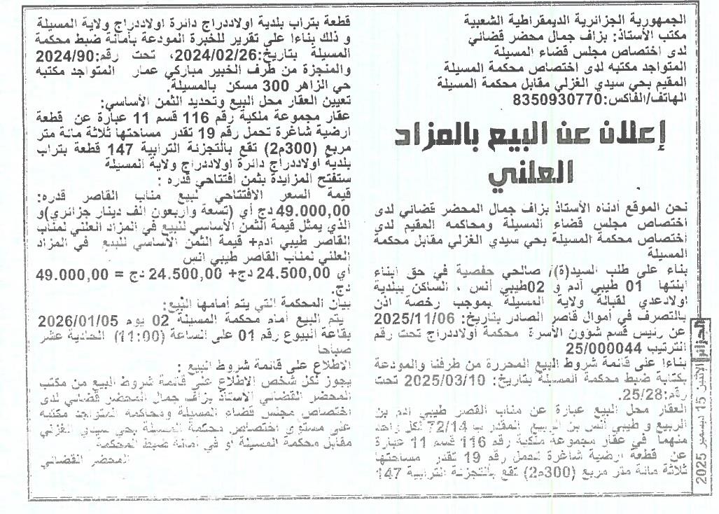 Il sera procédé à la vente au plus offrant et dernier enchérisseur le :