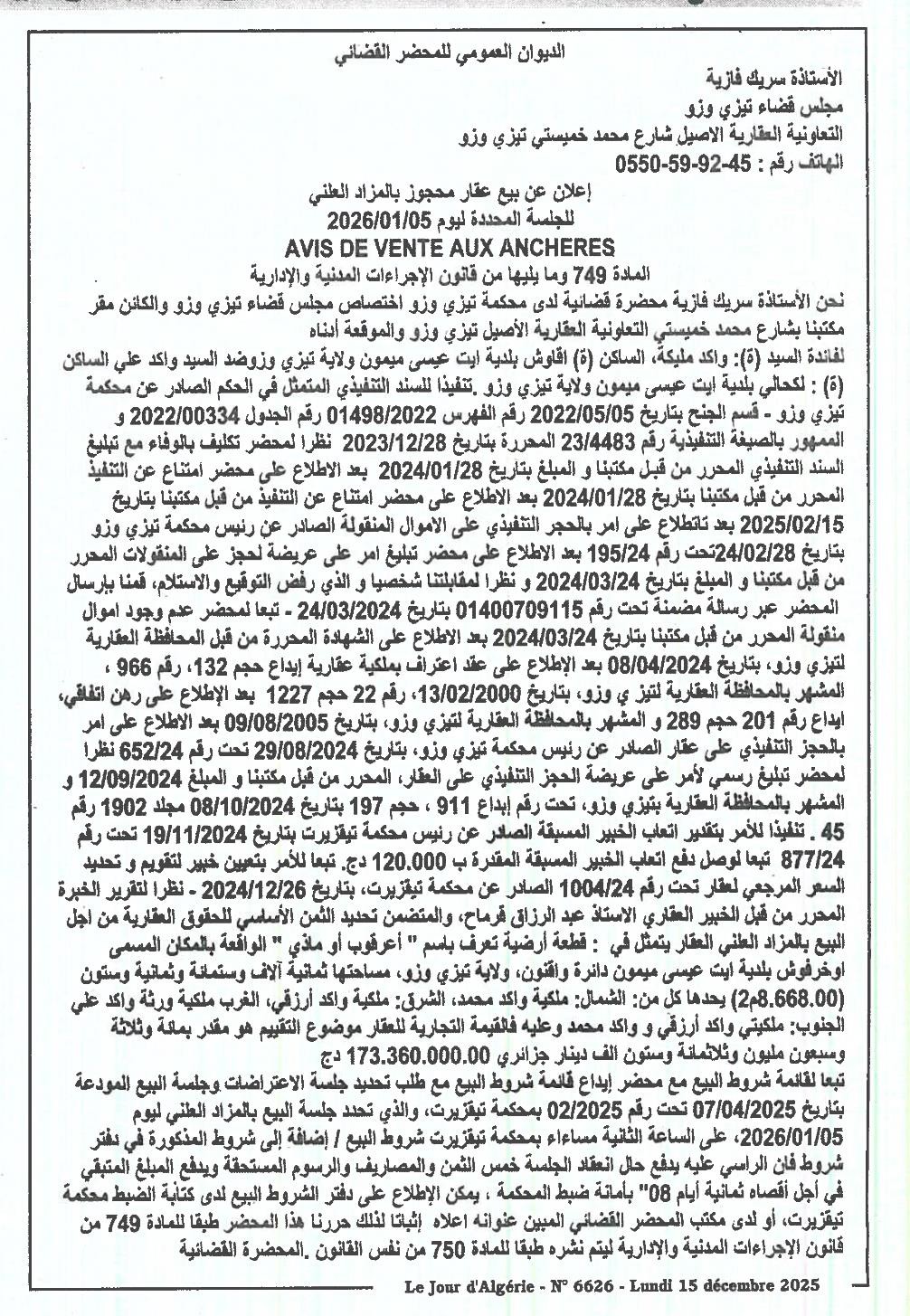 Il sera procédé à la vente au plus offrant et dernier enchérisseur le :