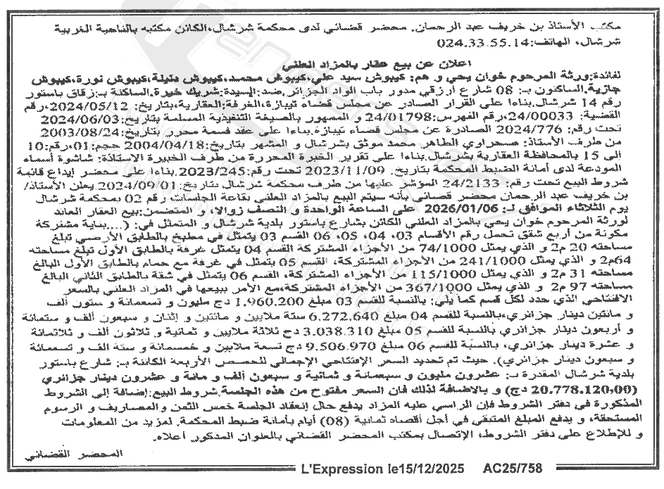 Il sera procédé à la vente au plus offrant et dernier enchérisseur le :