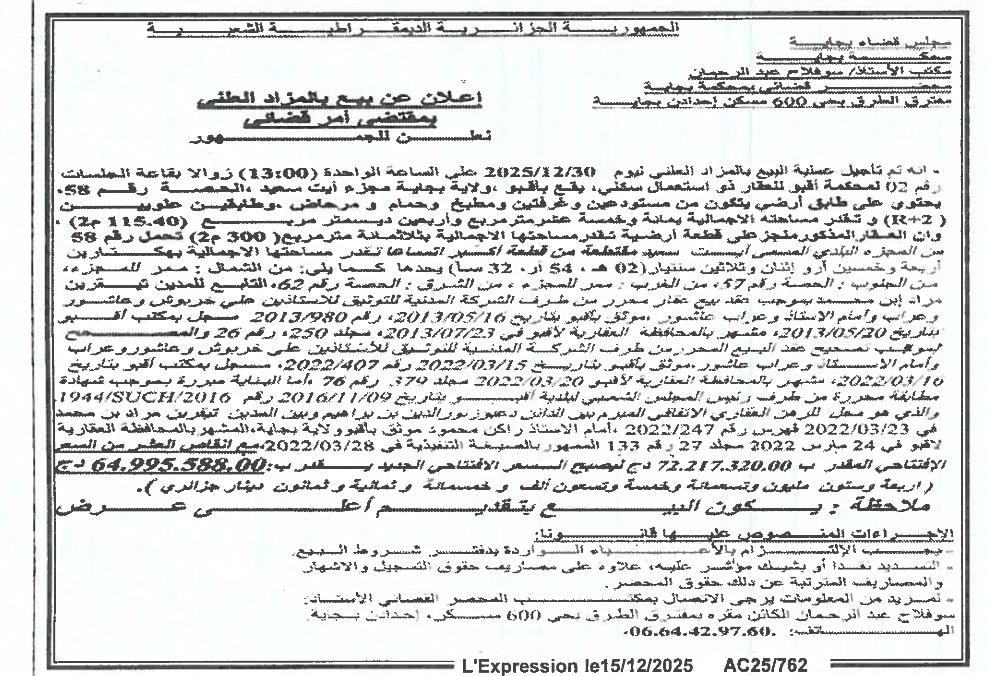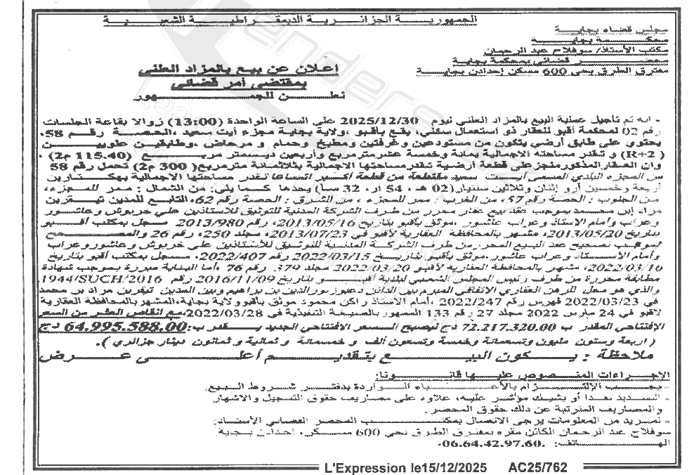Il sera procédé à la vente au plus offrant et dernier enchérisseur le :