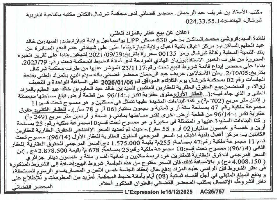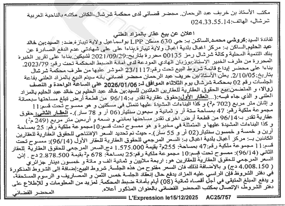 Il sera procédé à la vente au plus offrant et dernier enchérisseur le :