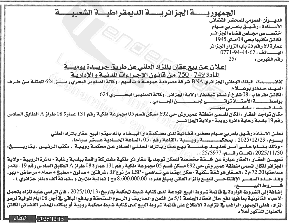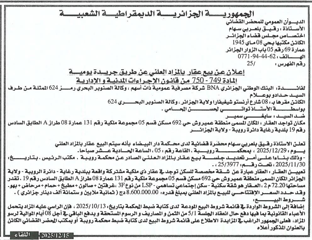 Il sera procédé à la vente au plus offrant et dernier enchérisseur le :