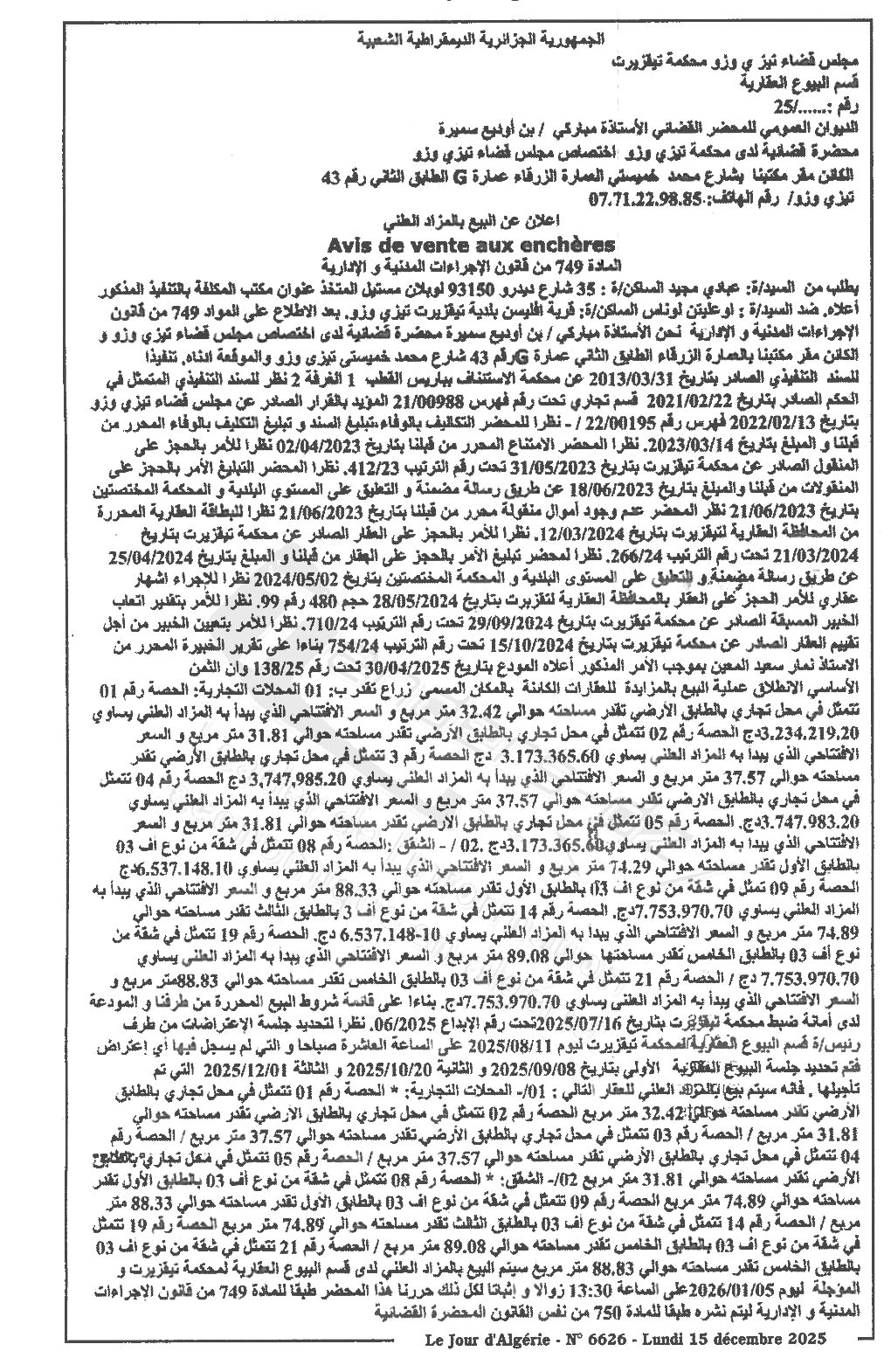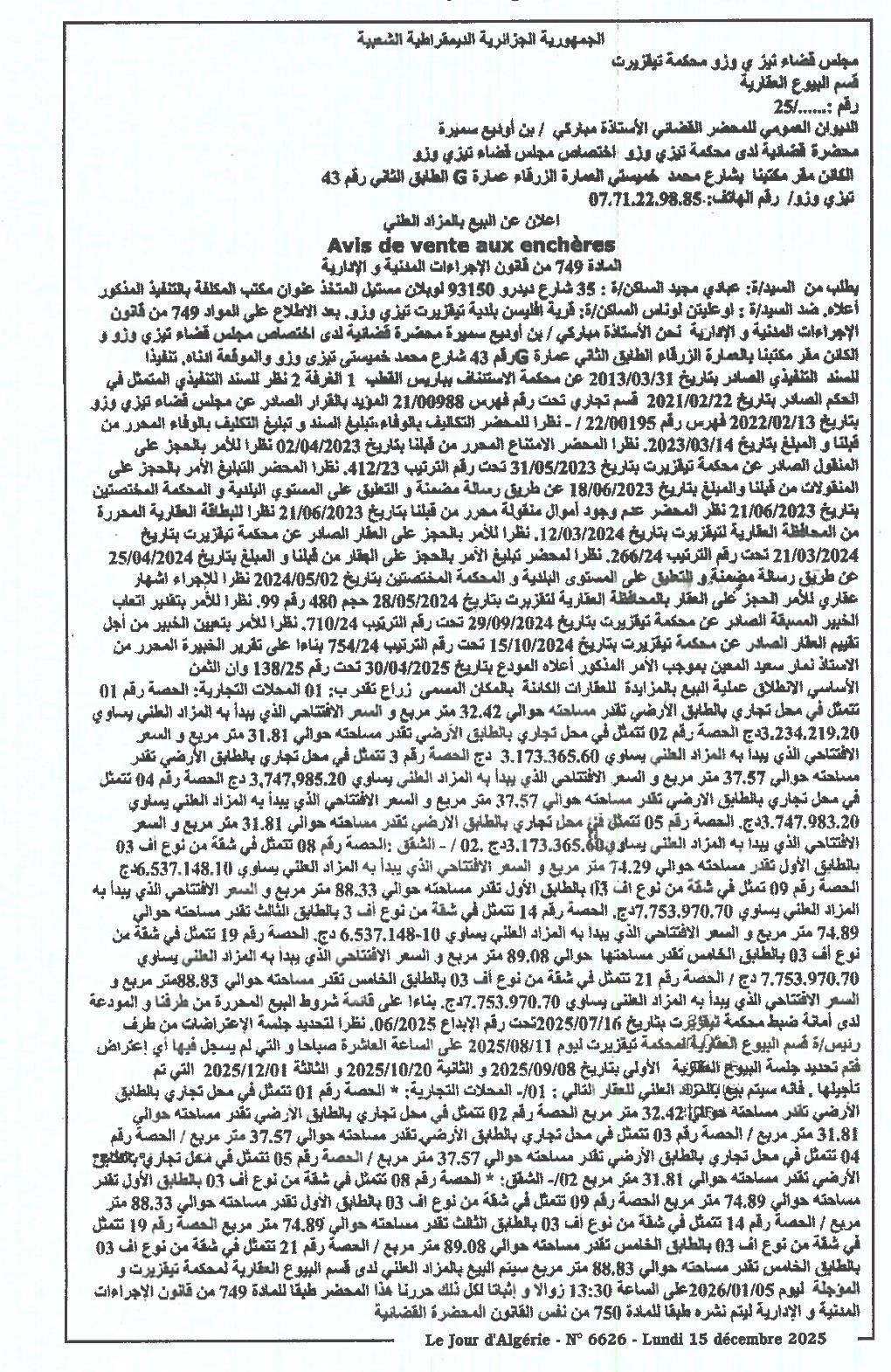 Il sera procédé à la vente au plus offrant et dernier enchérisseur le :