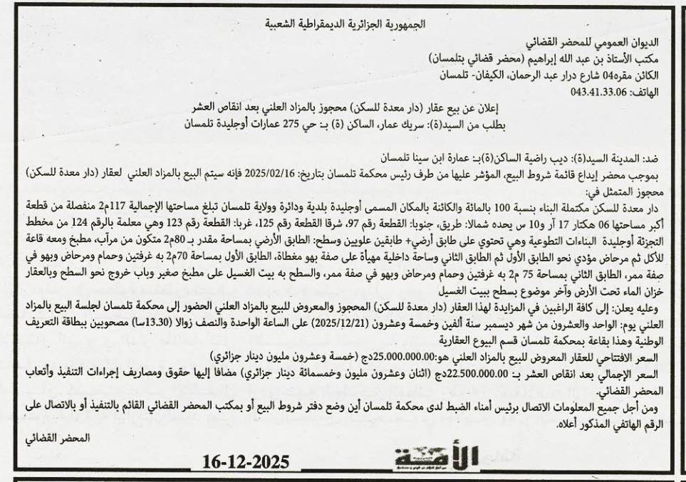 Il sera procédé à la vente au plus offrant et dernier enchérisseur le : 21/12/2025';