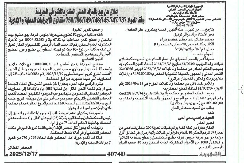 Il sera procédé à la vente au plus offrant et dernier enchérisseur le :
