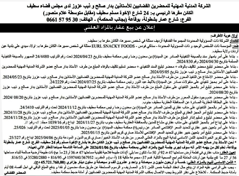 Il sera procédé à la vente au plus offrant et dernier enchérisseur le : 06/01/2026';