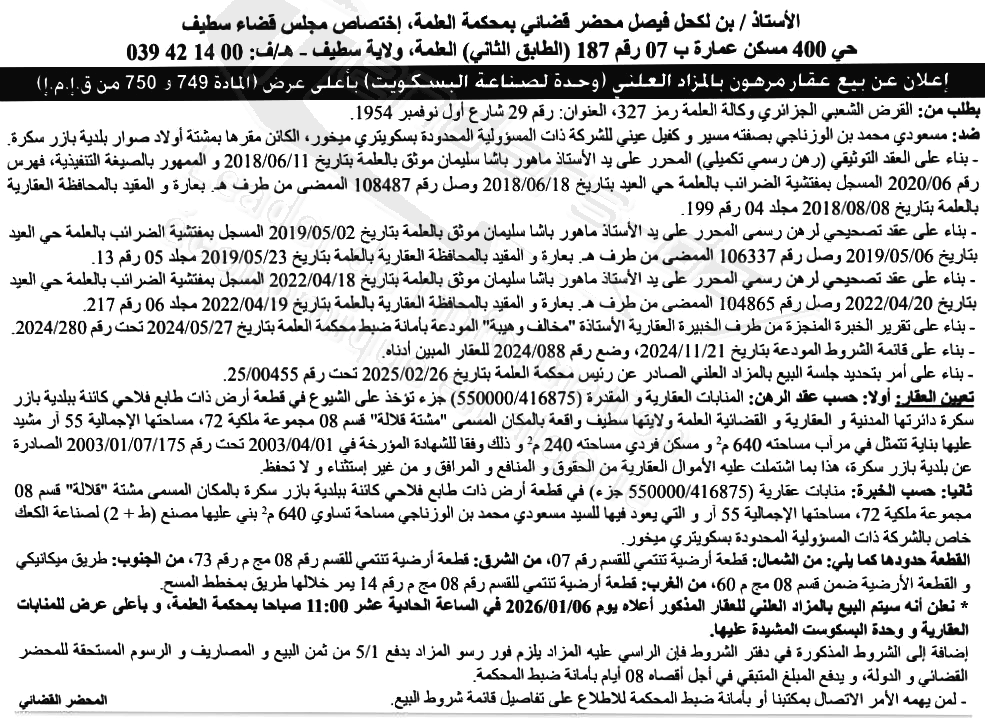 Il sera procédé à la vente au plus offrant et dernier enchérisseur le : 06/01/2026';