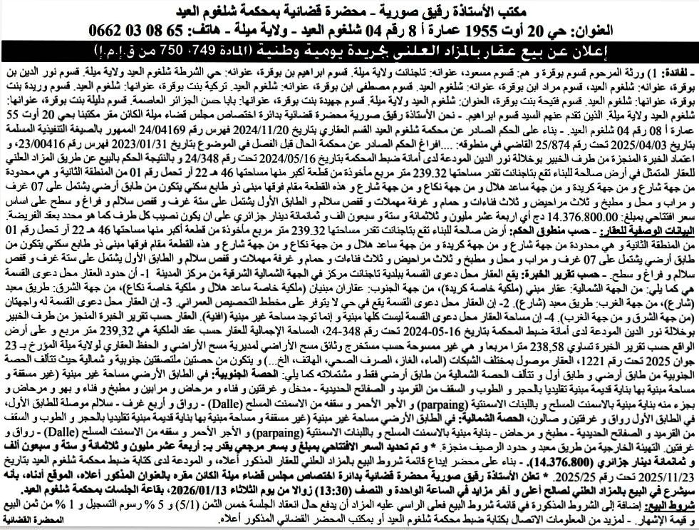 Il sera procédé à la vente au plus offrant et dernier enchérisseur le :