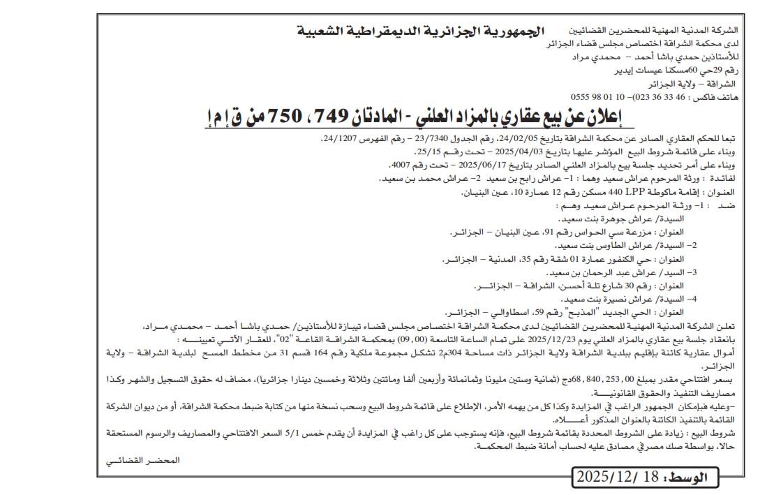 Il sera procédé à la vente au plus offrant et dernier enchérisseur le :