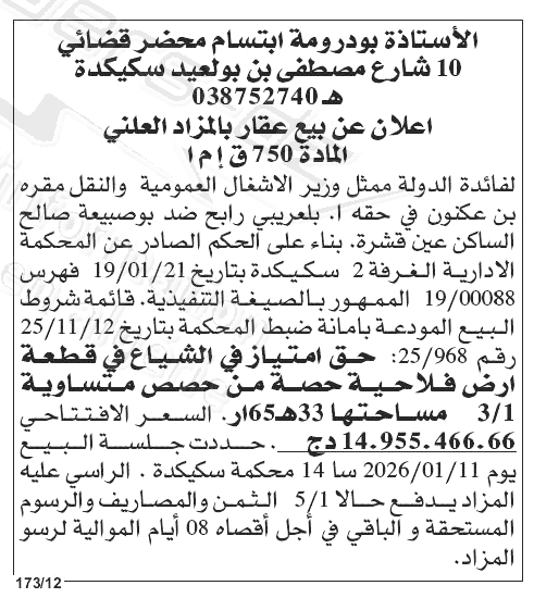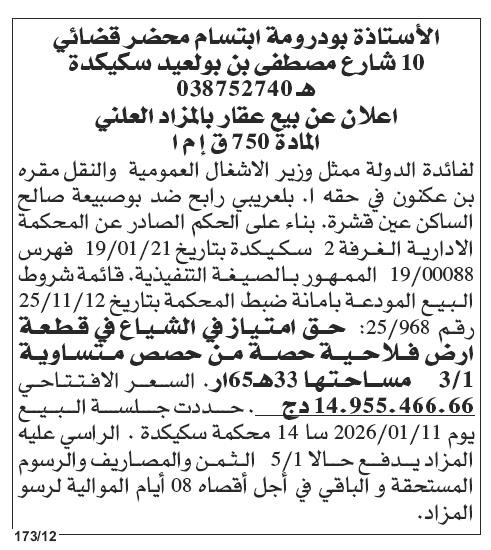 Il sera procédé à la vente au plus offrant et dernier enchérisseur le :