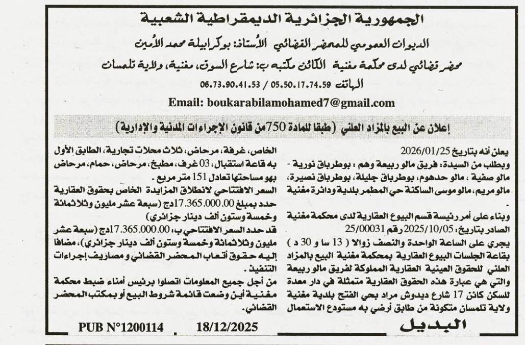 Il sera procédé à la vente au plus offrant et dernier enchérisseur le : 25/12/2025';