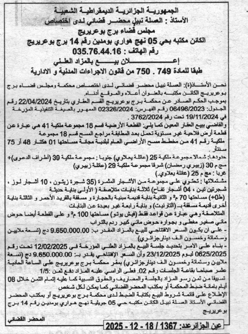 Il sera procédé à la vente au plus offrant et dernier enchérisseur le : 25/12/2025';