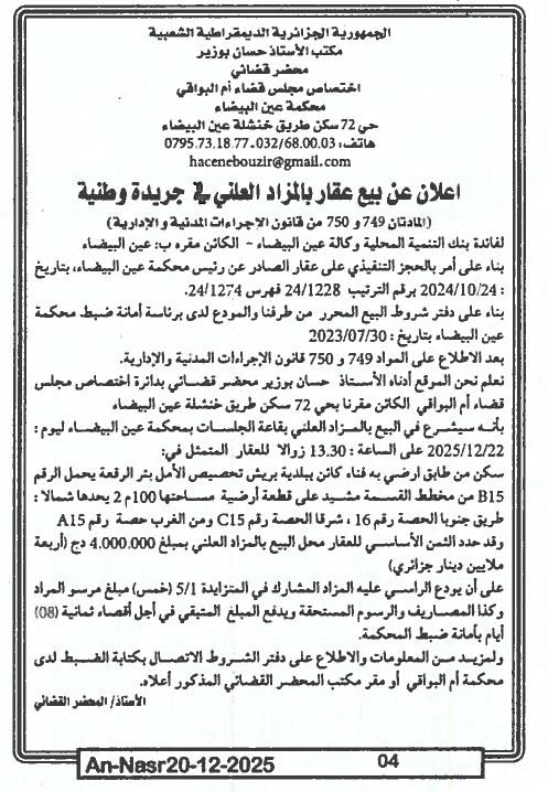 Il sera procédé à la vente au plus offrant et dernier enchérisseur le :