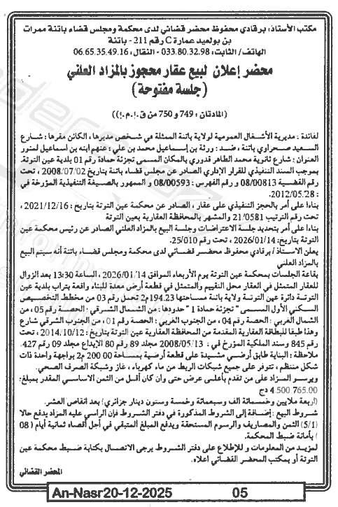 Il sera procédé à la vente au plus offrant et dernier enchérisseur le : 27/12/2025';