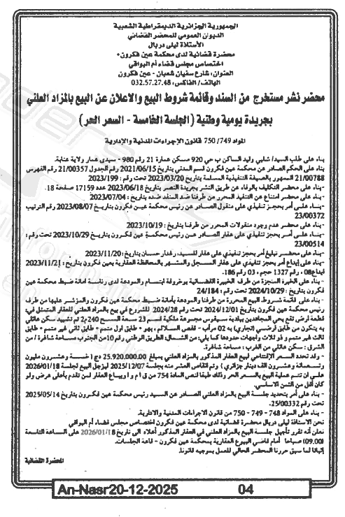 Il sera procédé à la vente au plus offrant et dernier enchérisseur le : 27/12/2025';