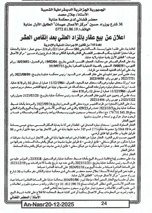 Il sera procédé à la vente au plus offrant et dernier enchérisseur le :
