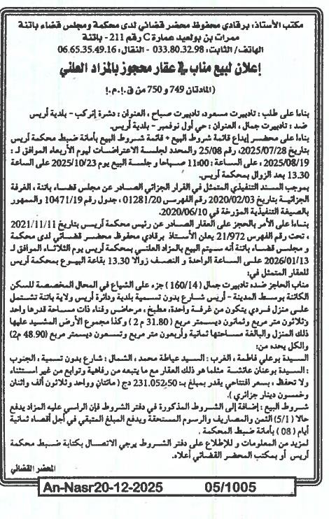 Il sera procédé à la vente au plus offrant et dernier enchérisseur le : 27/12/2025';