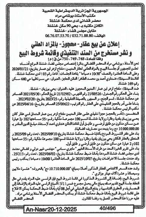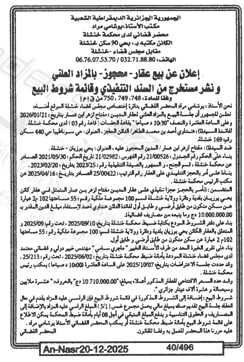 Il sera procédé à la vente au plus offrant et dernier enchérisseur le : 27/12/2025';