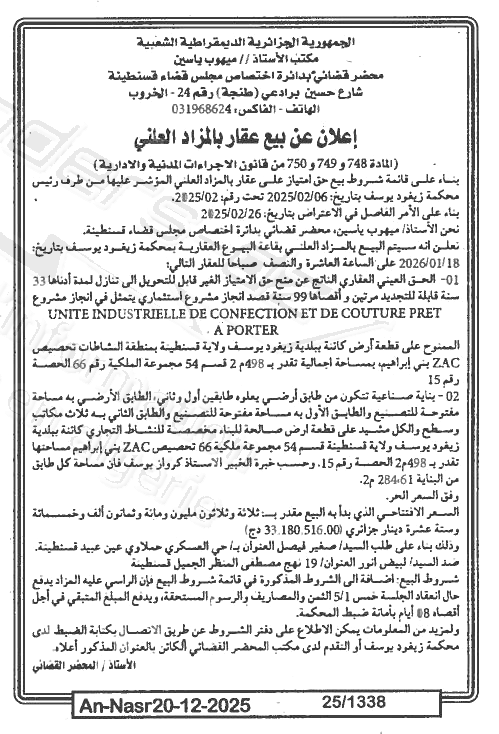 Il sera procédé à la vente au plus offrant et dernier enchérisseur le : 27/12/2025';
