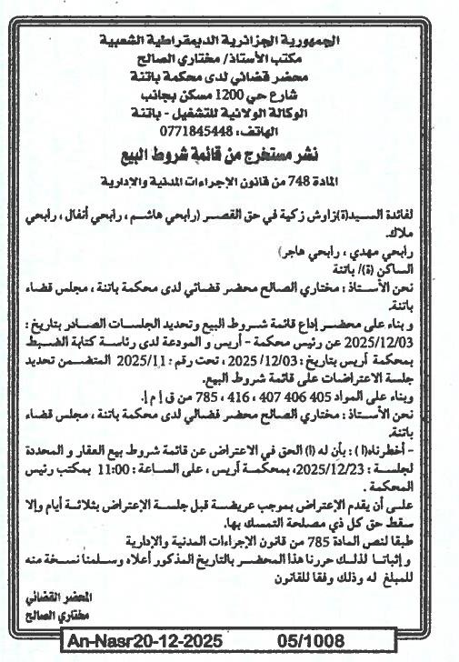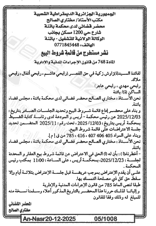 Il sera procédé à la vente au plus offrant et dernier enchérisseur le : 27/12/2025';