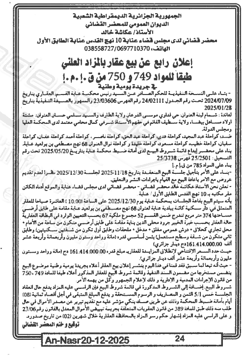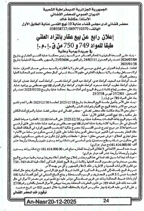 Il sera procédé à la vente au plus offrant et dernier enchérisseur le : 27/12/2025';