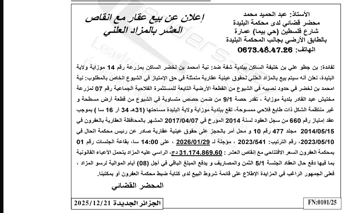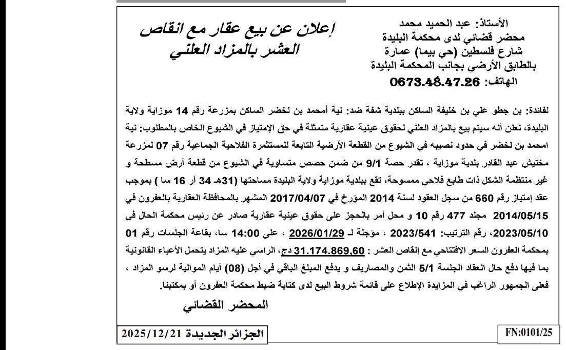 Il sera procédé à la vente au plus offrant et dernier enchérisseur le : 28/12/2025';