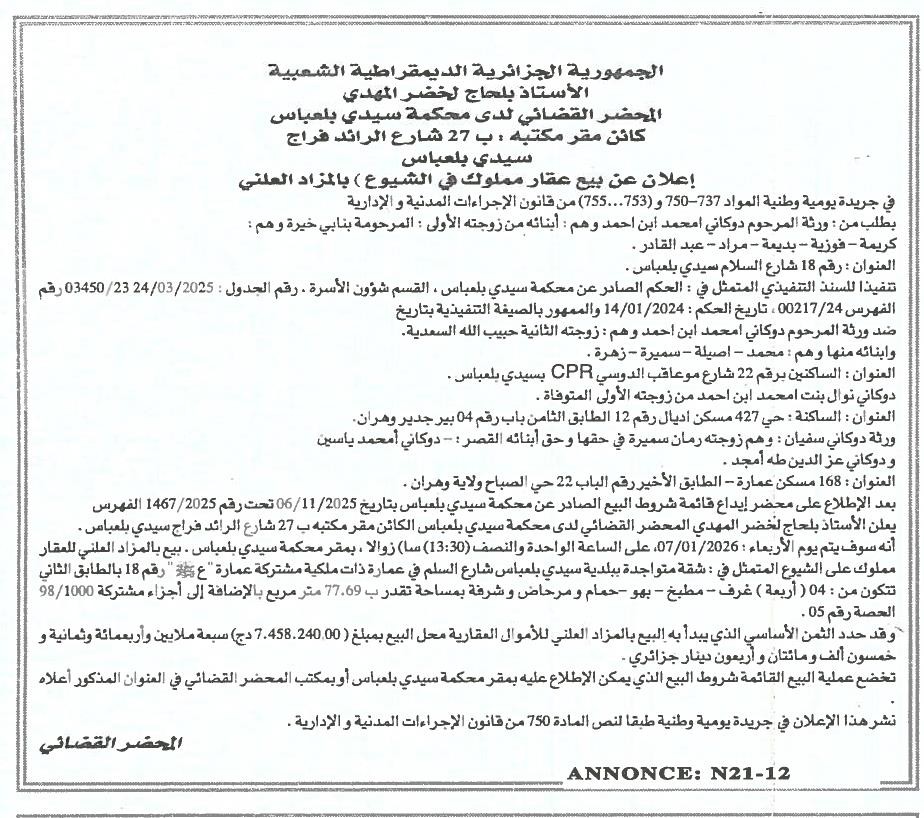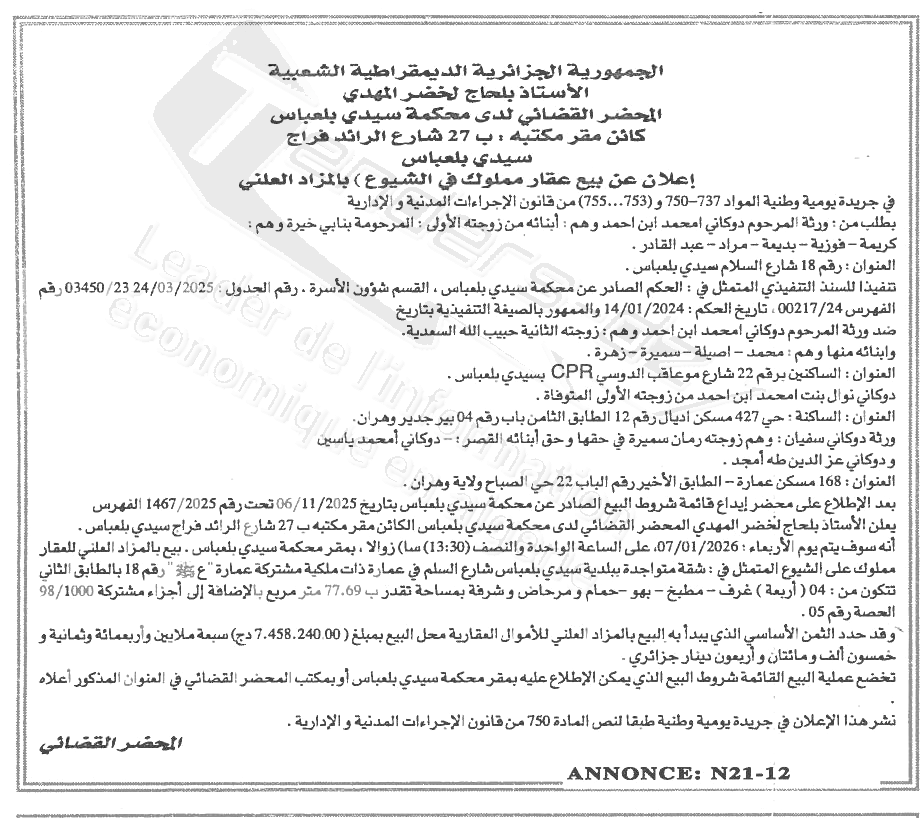 Il sera procédé à la vente au plus offrant et dernier enchérisseur le :