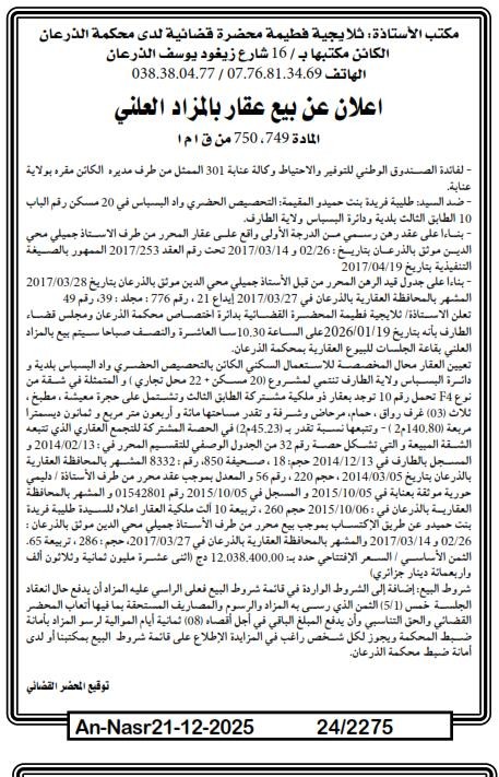 Il sera procédé à la vente au plus offrant et dernier enchérisseur le : 28/12/2025';